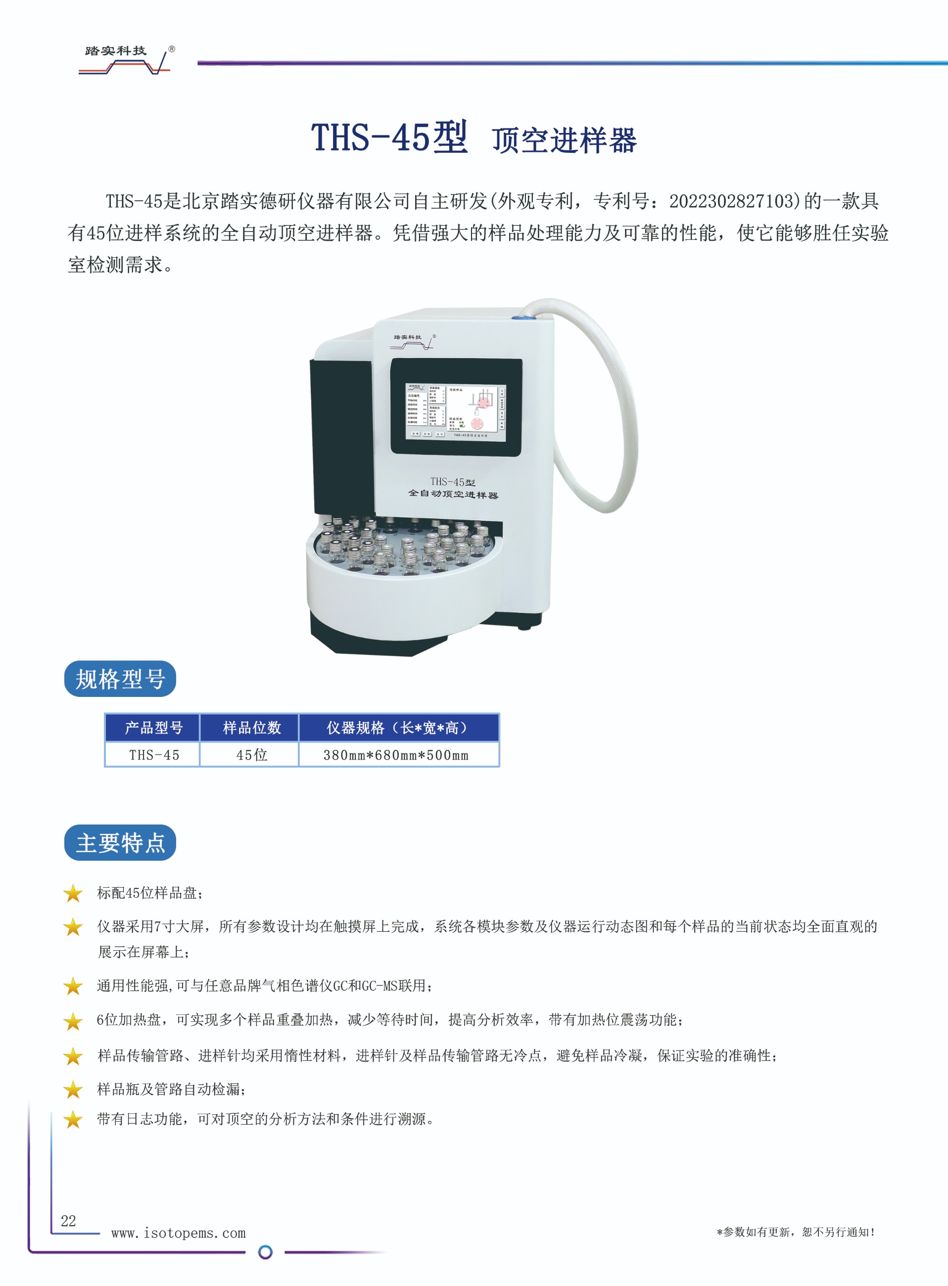 THS-45型頂空進樣器是一款具有45位進樣系統(tǒng)的全自動頂空進樣器。廣泛應(yīng)用于醫(yī)療衛(wèi)生,環(huán)保,石油化工,食品行業(yè),制藥等領(lǐng)域。該儀器符合HJ 736-2015土壤和沉積物揮發(fā)性鹵代烴的測定 頂空氣相色譜-質(zhì)譜法》、《HJ 741-2015 土壤和沉積物  揮發(fā)性有機物的測定 頂空/氣相色譜法》、GA/T 842-2019  血液酒精含量的檢驗方法》、《HJ 1067-2019水質(zhì) 苯系物的測定 頂空/氣相色譜法》、《HJ 810-2016水質(zhì)揮發(fā)性有機物的測定 頂空氣相色譜-質(zhì)譜法》等標(biāo)準(zhǔn)。